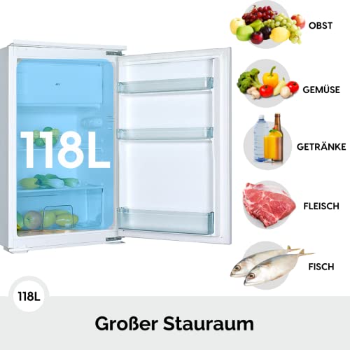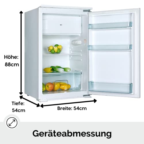 PKM KS120.4EB Einbaukühlschrank mit Gefrierfach | 88cm Höhe | 105L Kühlteil | 15L Gefrierteil | 4**** Gefrierfach | 223 kWh/Jahr | Türanschlag wechselbar | Höhenverstellbare Füße | Weiß