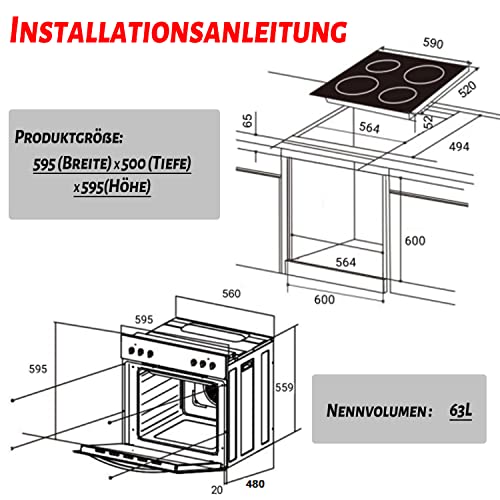 【Installation und Produktgröße】: Einbauschnittmaß-Ofen: 600 x 600 x 494 mm (H x B x T) | Einbauschnittmaß-Kochfeld: 65 x 564 x 494 mm (H x B x T). Ofen-Maße: 595 x 595 x 500 mm (H x B x T) | Kochfeld-Maße: 52 x 590 x 520 mm (H x B x T)